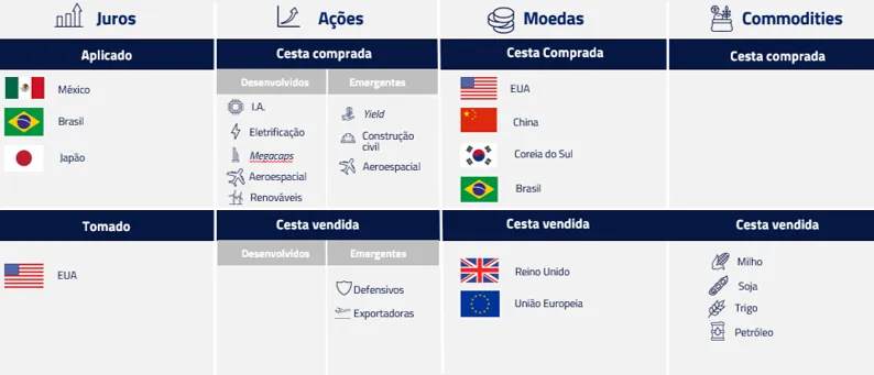 Em ações brasileiras, passamos a trabalhar vendidos em índices, entendendo que a elevação recente de preços não encontra respaldo proporcional na evolução dos lucros. Mantemos posições específicas em utilities, no programa habitacional e na Embraer, mas protegemos a carteira com posições táticas vendidas.