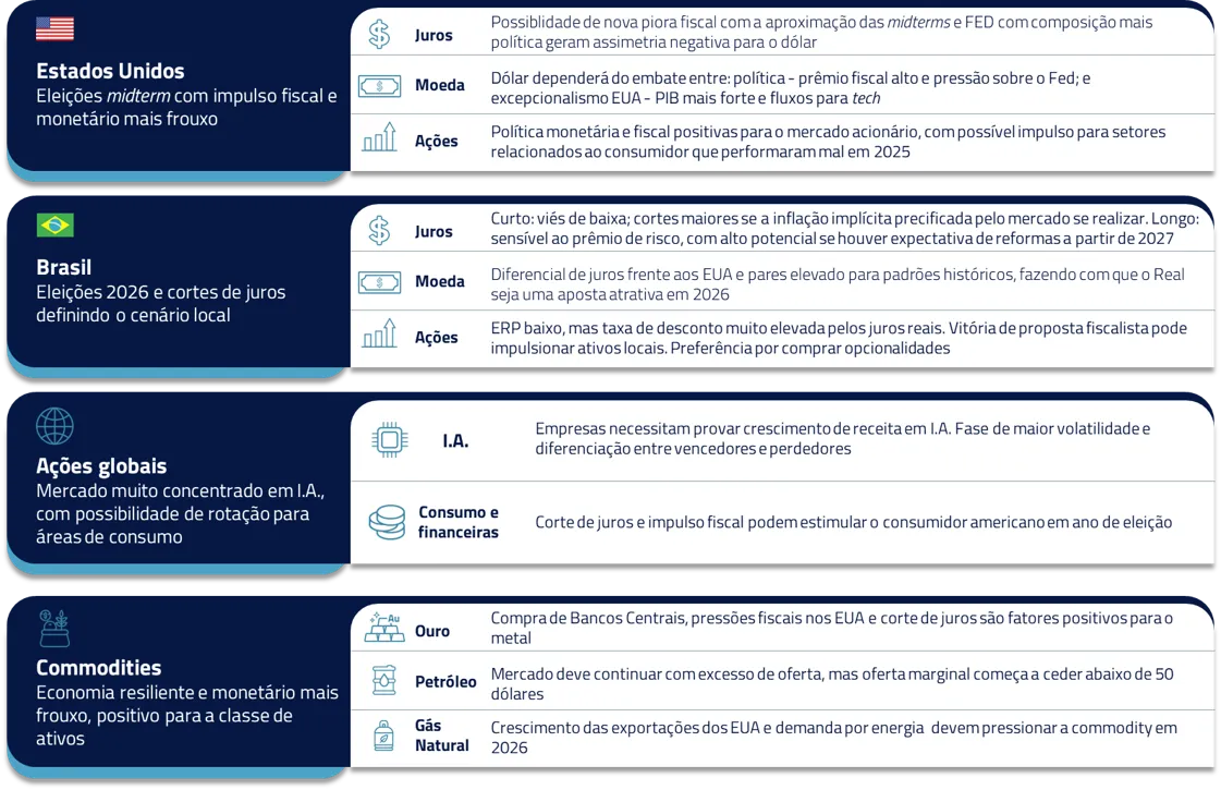 E, nos juros, analisamos o início de um ciclo de redução do aperto monetário a partir do primeiro trimestre, cuja extensão pode ser mais profunda do que o mercado atualmente precifica.