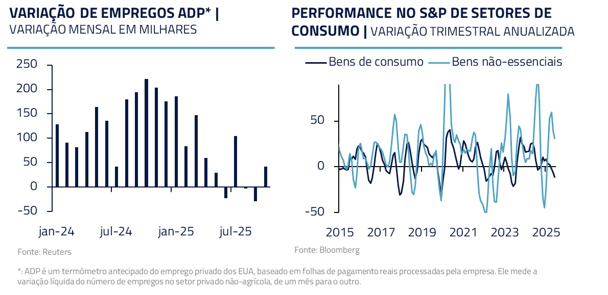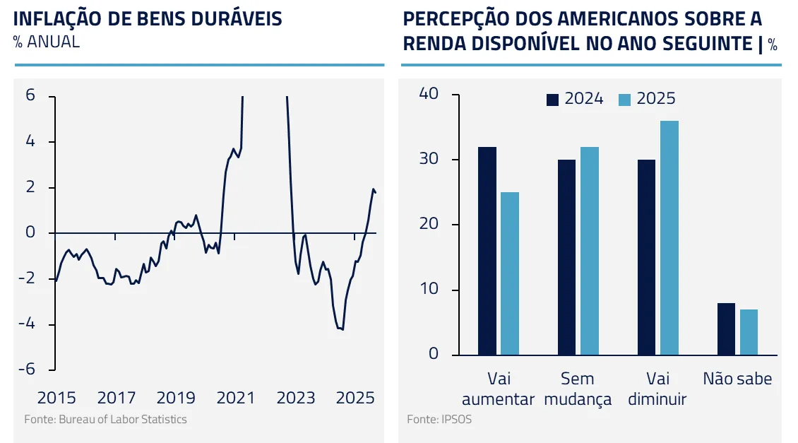 Esse quadro tem gerado uma centralidade cada vez maior do tema “custo de vida” para o eleitor, quando o mercado de trabalho dá sinais de fragilidade. Em especial, o momento atual da economia americana se configura como um “crescimento em K”, onde o consumo de alta renda se sustenta enquanto o consumo da baixa renda perde tração.