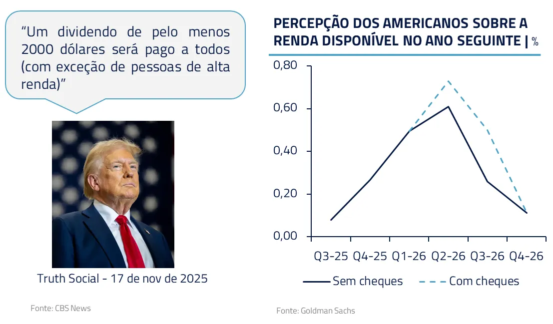 A ideia mais recente propagandeada pelo presidente é usar parte das receitas extras das tarifas para “devolver” para a população via cheques ou rebates de impostos. Seria equivalente a mais 0,5% de PIB na mão do consumidor.
