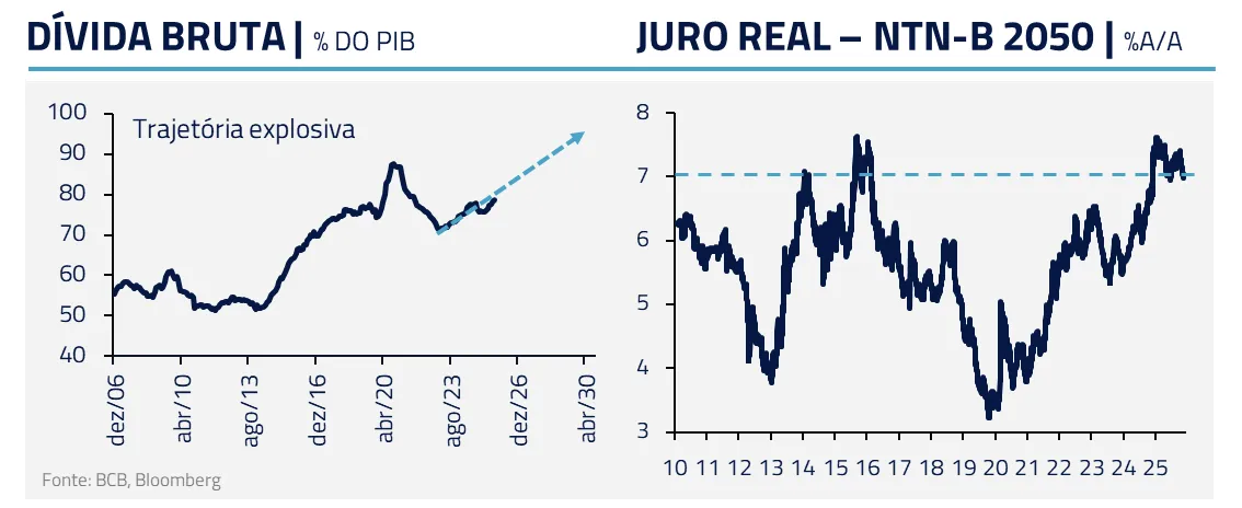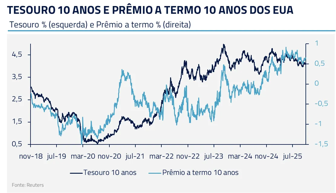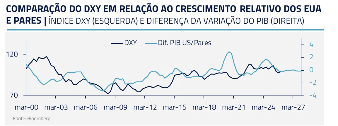 Esse desgaste constante não poupa as principais âncoras do sistema financeiro. Expansão fiscal adicional combinada com um Federal Reserve remodelado por indicações de Trump — provavelmente mais tolerantes à inflação visando cortes de juros — cria um ambiente no qual a credibilidade fiscal passa a depender não apenas da política monetária, mas, principalmente, da capacidade de crescimento da economia. Nesse sentido, dólar e taxas longas ficam sob os holofotes.