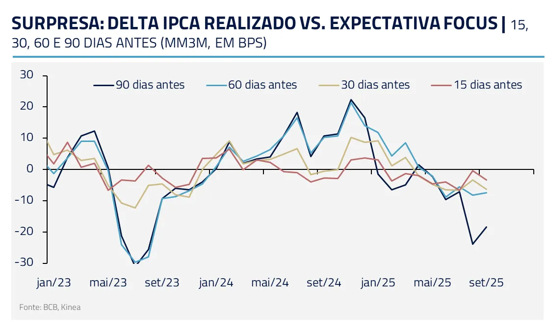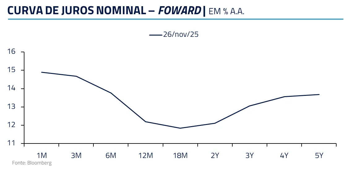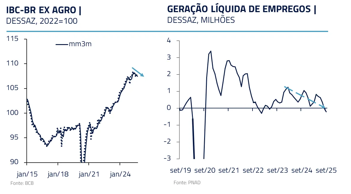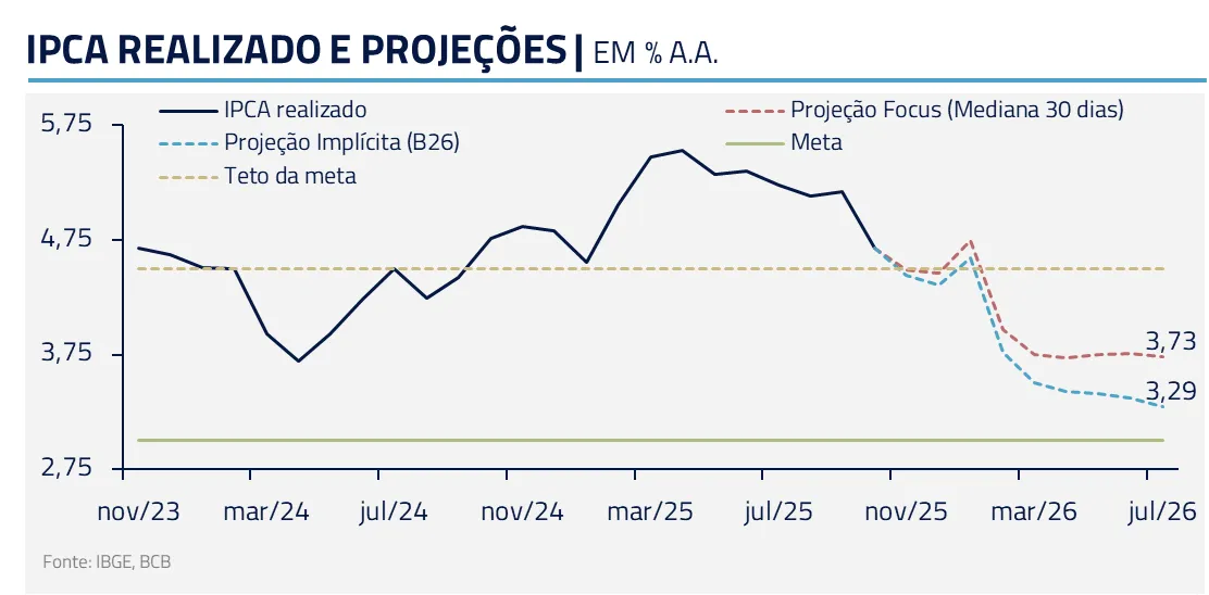 Tudo indica que o Banco Central cumprirá a meta dentro do intervalo neste ano, com expectativas em queda — ainda que sem tocar os 3% formais. Para 2026, esperamos núcleos rodando abaixo de 4%, o que, aliado à desaceleração da atividade em curso, irá criar condições suficientes para o Banco Central começar a reduzir o aperto monetário no primeiro trimestre.