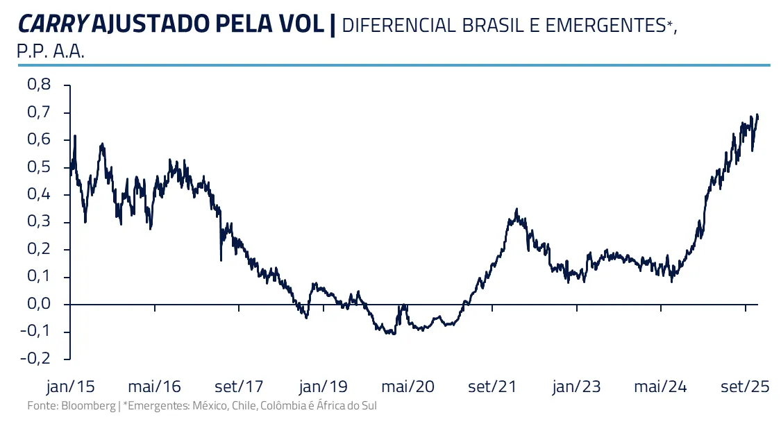 A partir desse pano de fundo, exploramos hoje as três vertentes centrais dos ativos brasileiros. No real, avaliamos o potencial do carrego (carry) num ambiente de juros ainda elevados e volatilidade relativamente baixa.
