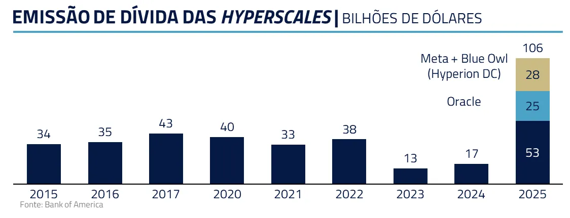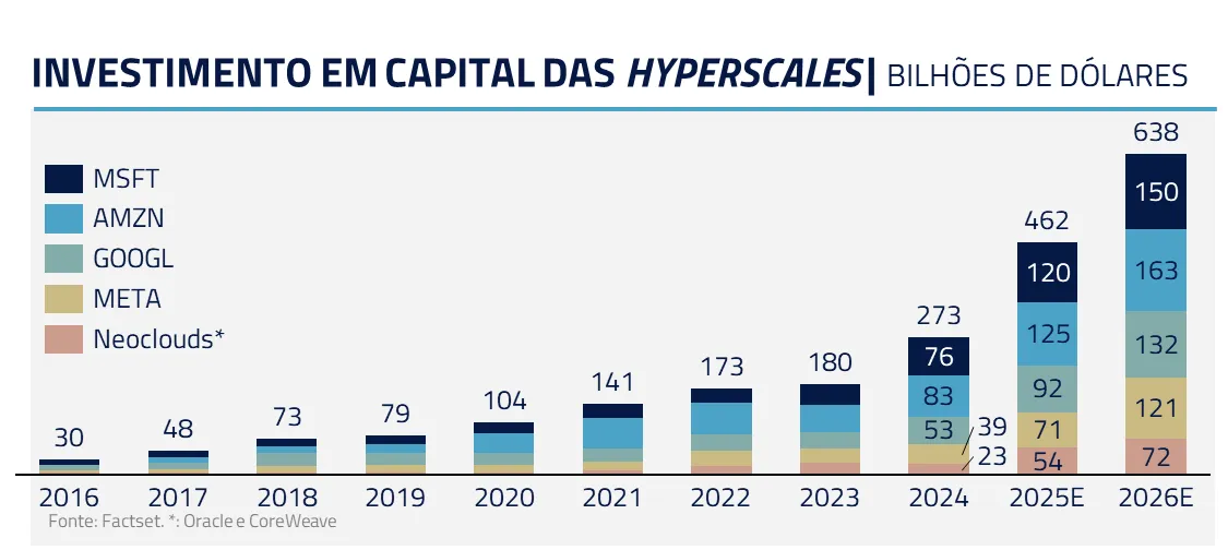 O ano de 2025 foi marcado por uma expansão extraordinária de CAPEX, um ciclo de construção de data centers que cresceu trimestre após trimestre e levou o investimento combinado das hyperscalers a superar a marca de US$ 600 bilhões.