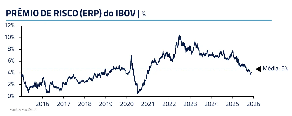 O prêmio de risco dos ativos brasileiros já está próximo da média histórica, mas com os juros reais longos ainda em níveis incompatíveis com um ciclo sustentável de valorização dos ativos domésticos.