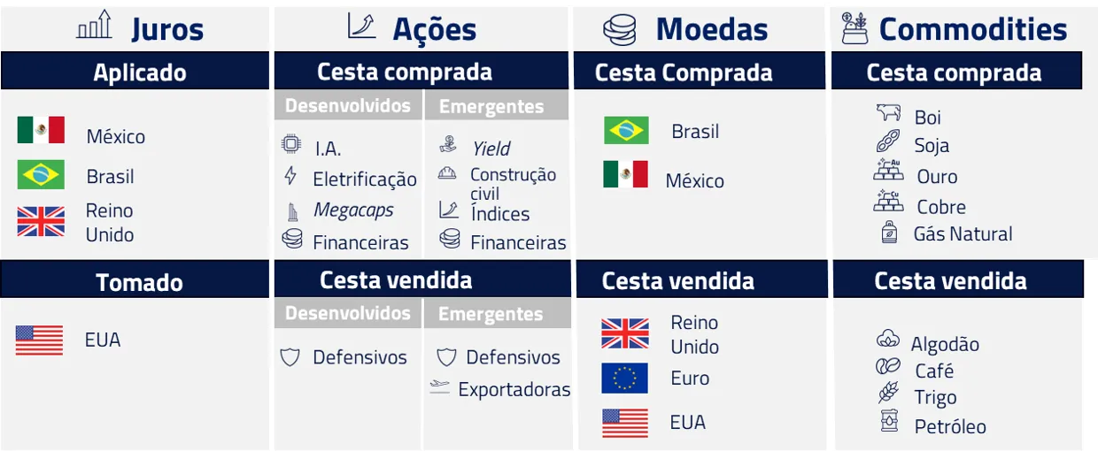 Por fim, na inflação, hoje o mercado precifica que esta irá convergir para 3,3% já em meados de 2026. Estamos comprando essa inflação como proteção para nossas posições para quedas de juros no país. Afinal, se o mercado estiver certo de que a inflação irá para tão perto do centro da meta, o espaço para corte do BC deverá ser maior do que os 250bps que estão na curva de juros.