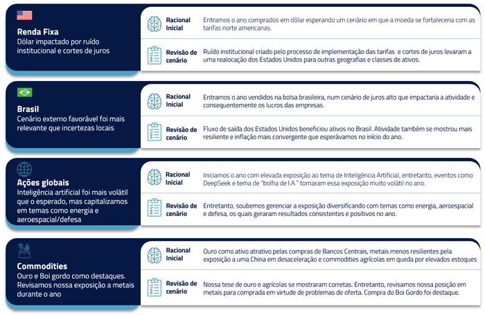 Após o Liberation Day, ajustamos nosso portfólio, incorporando os novos vetores macroeconômicos. Esse reposicionamento foi determinante para os resultados positivos registrados ao longo do segundo semestre.