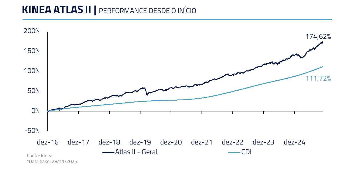 Ao longo desse período, entregamos uma trajetória sólida: aproximadamente 155% do CDI desde o início, com consistência de resultados e rápida recuperação de perdas. Mesmo em 2020, um dos anos mais difíceis para a indústria, nosso desempenho foi 93% do CDI, preservando capital e, sobretudo, a integridade de nosso processo e de nossa equipe.