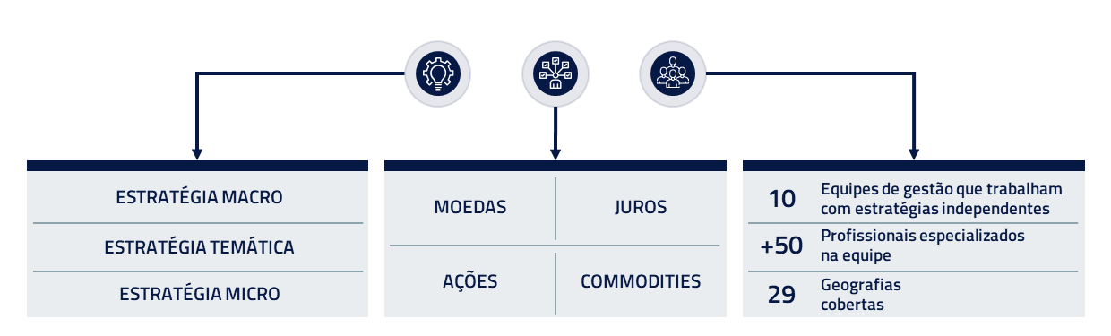 O processo em que baseamos nossos multimercados, e que permanece em evolução, é o resultado da nossa visão de que um multimercado moderno deve combinar o macro com o micro e o temático, ser baseado em uma cultura de constante treinamento e desenvolvimento de equipe e combinar especialistas com generalistas em um ambiente de multigestores.