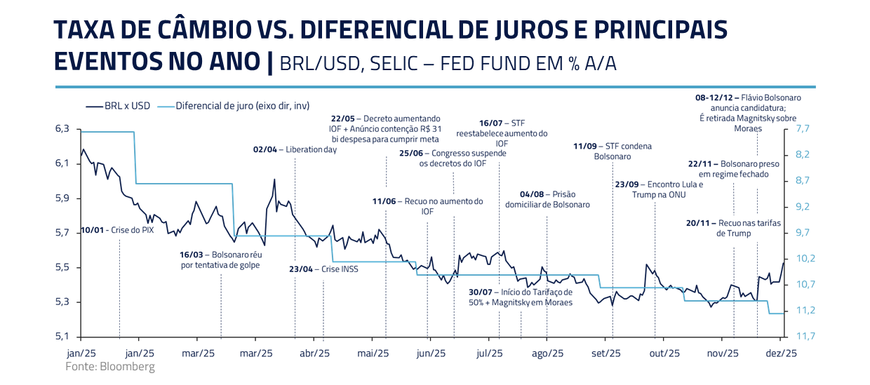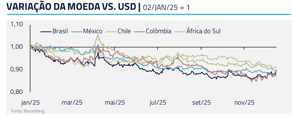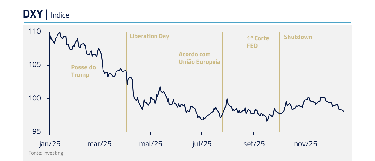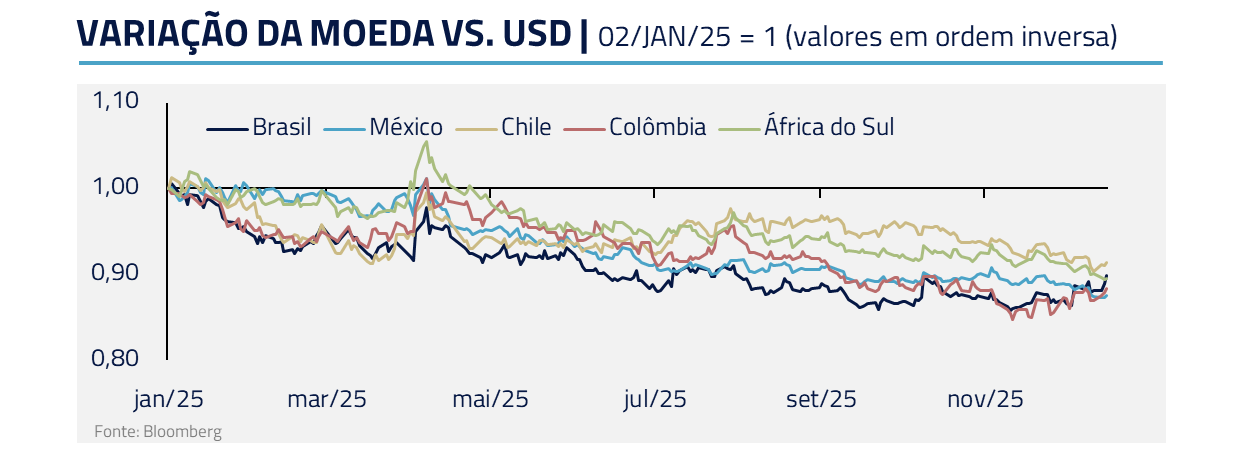 O movimento contrário acabou prevalecendo, com a desvalorização da moeda americana. O Brasil e outras geografias emergentes passaram a se beneficiar de fluxos direcionados para mercados mais descontados e com melhor carry, o que deu suporte aos ativos locais ao longo do ano.