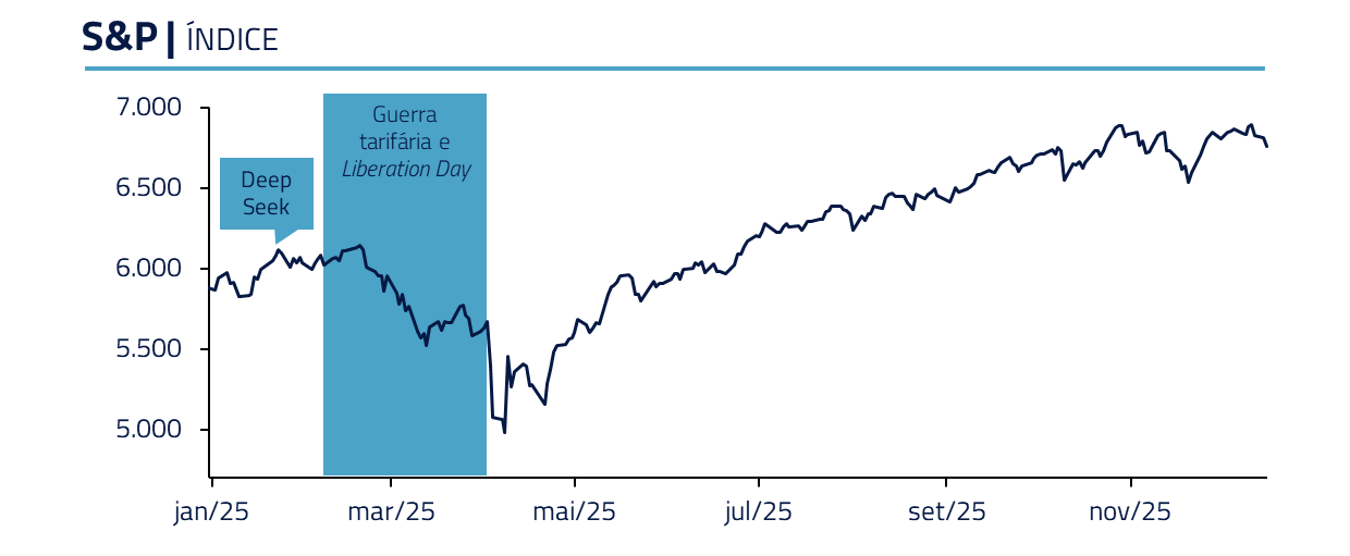 Na renda variável global, o início de 2025 também trouxe volatilidade acima do esperado. O DeepSeek Day, que acendeu dúvidas sobre a sustentabilidade dos investimentos em data centers, somou-se aos efeitos do Liberation Day e resultou em correções relevantes no primeiro trimestre do ano.