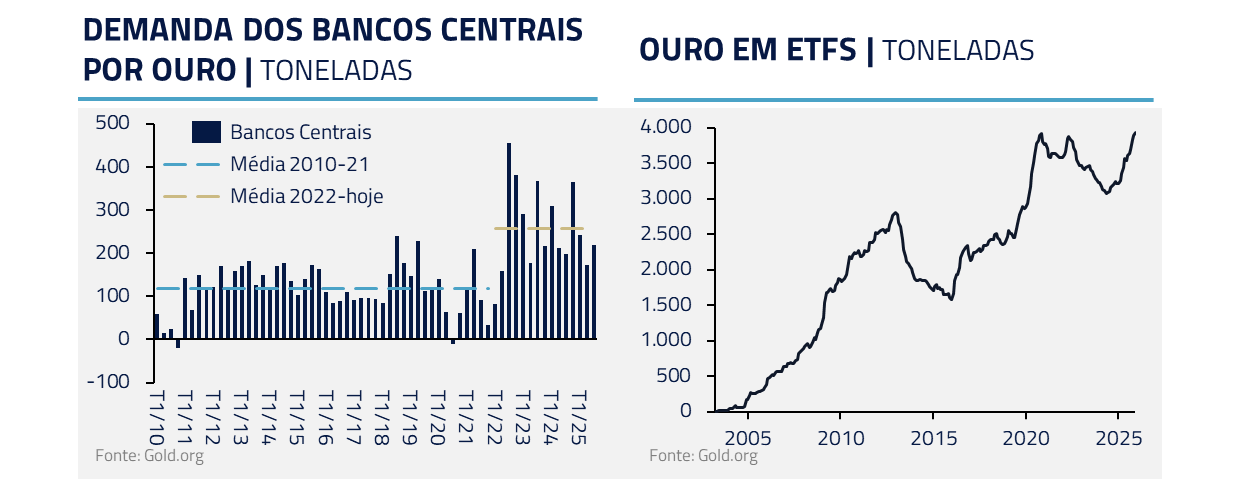 O ouro tornou-se nosso principal destaque no ano, ao compreendermos a combinação entre desvalorização do dólar, compras sistemáticas dos Bancos Centrais e o ambiente de busca por alternativas de reserva de valor em um mundo mais fragmentado.
