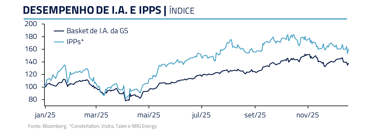 Nas bolsas internacionais, mantivemos nossa convicção estrutural nos temas ligados à Inteligência Artificial — eletrificação, energia, semicondutores e infraestrutura de cloud. A volatilidade do início do ano deu lugar a uma recuperação consistente.