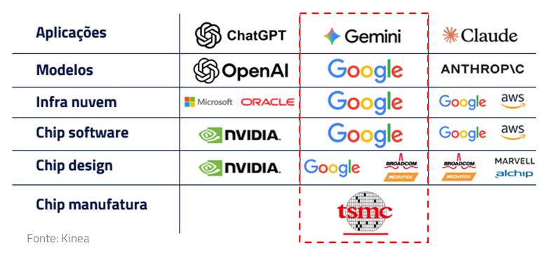 Se antes buscávamos uma exposição aos beneficiários dos vultuosos investimentos, hoje estamos focados em empresas que devem gerar receitas e crescer base de clientes, como no caso da Google, ou em áreas onde claramente há gargalos e vantagem competitiva, como no caso da TSMC e o mercado de memória.