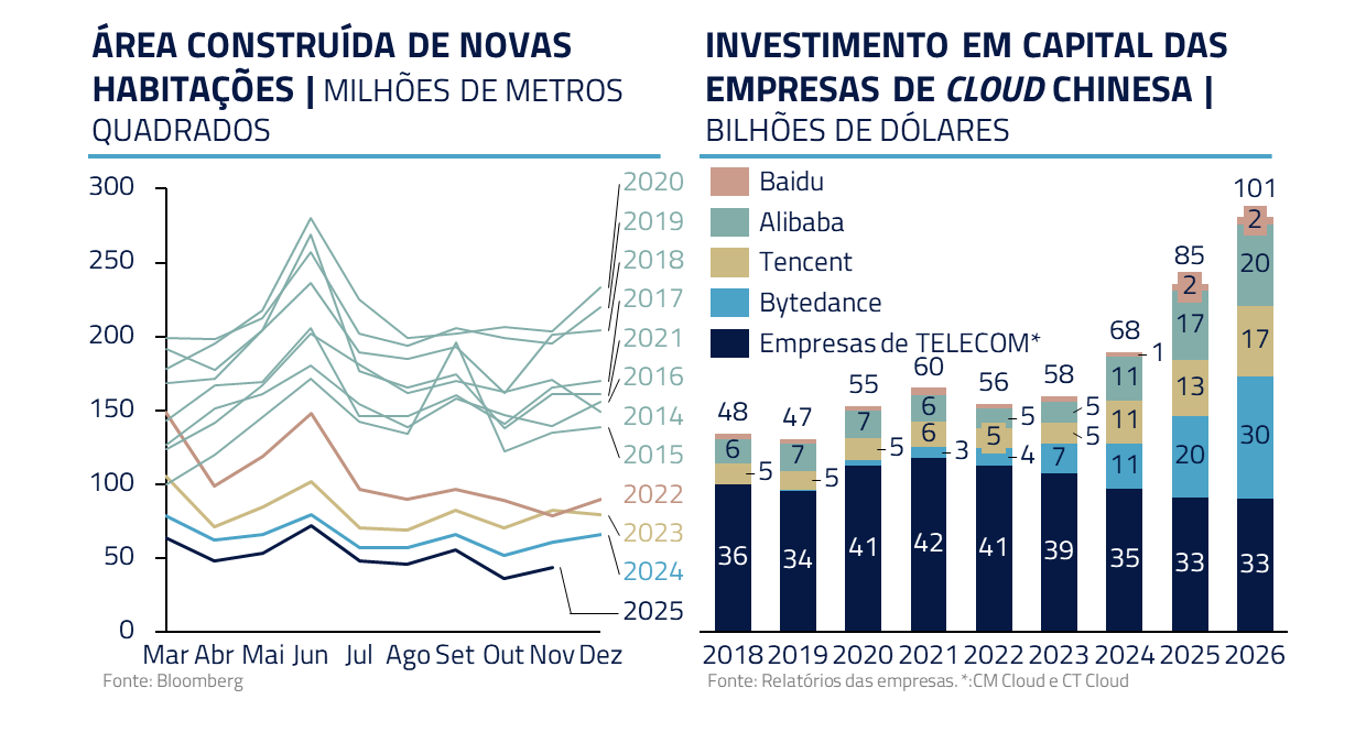 Nos emergentes, a China seguirá como uma economia de duas velocidades: um setor imobiliário estruturalmente enfraquecido convivendo com um setor tecnológico impulsionado por investimentos em I.A.