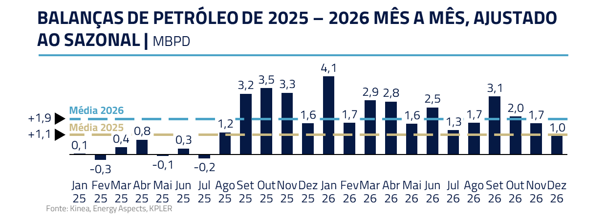Nas commodities, os preços do petróleo devem seguir em tendência de baixa: o superávit e os estoques altos devem persistir, puxados por uma produção não-OPEP em crescimento e uma OPEP que não sinaliza cortes. A geopolítica continuará decisiva, com possível avanço de um acordo entre Ucrânia e Rússia, o que dissiparia prêmios geopolíticos, enquanto monitoramos outros riscos como Venezuela e a indefinição do acordo nuclear com o Irã.
