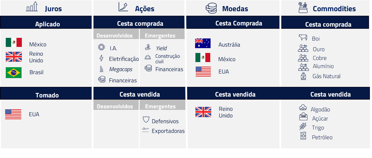 No Brasil, revisamos nossa postura e passamos a construir posições compradas na moeda, aproveitando um diferencial de juros elevado e um ambiente global mais favorável aos emergentes.