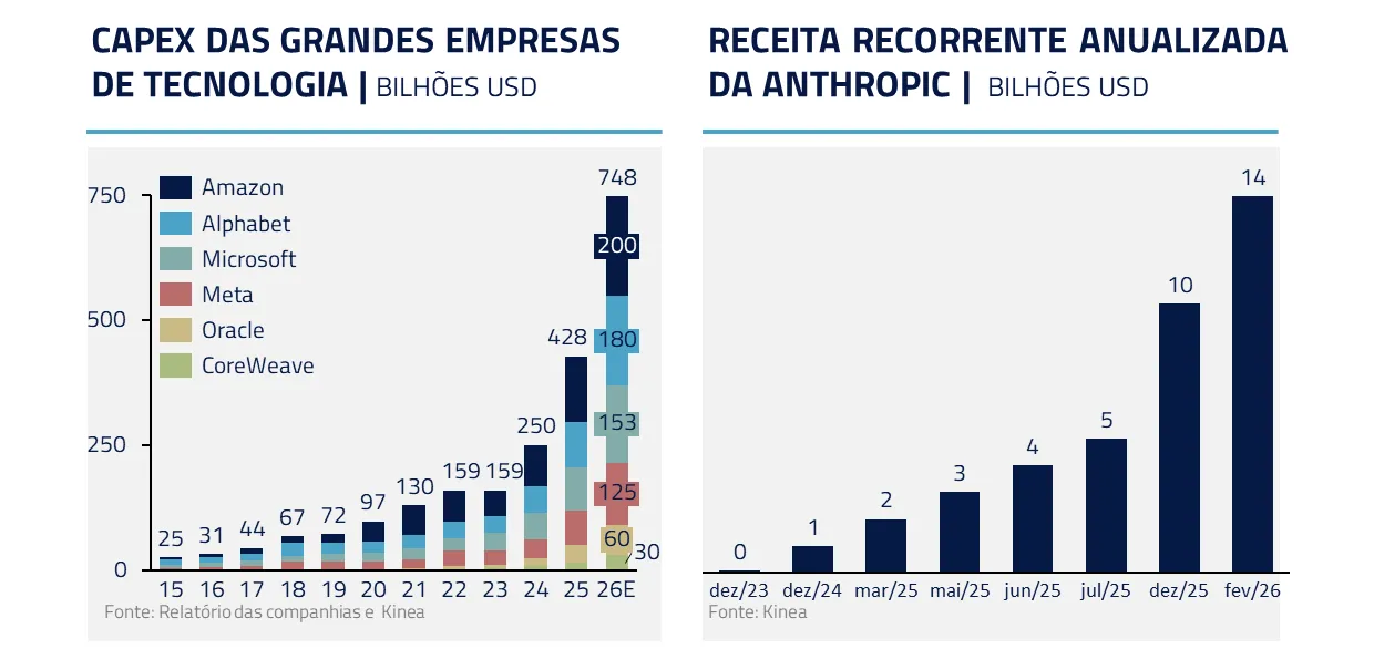Durante a última temporada de resultados, o mercado foi surpreendido pela reaceleração do CAPEX das grandes empresas de tecnologia. O forte crescimento da Anthropic e a expansão da base de usuários do ChatGPT reacenderam a corrida por supremacia em modelos e infraestrutura.