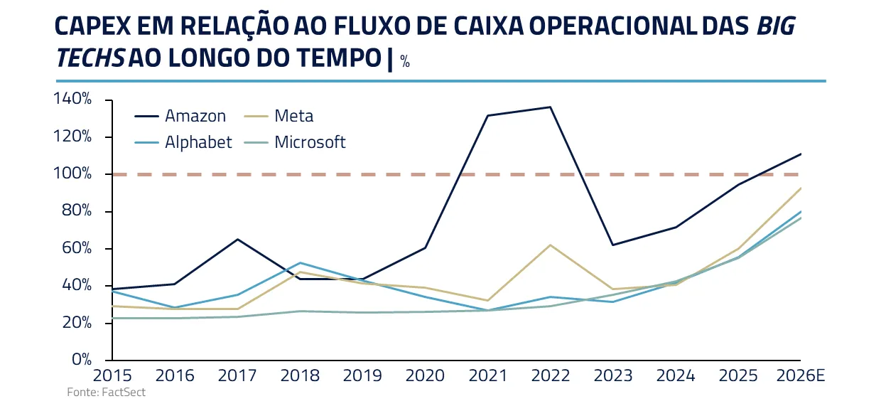 Google, Meta, Amazon e Microsoft passaram a investir praticamente 100% de seu fluxo de caixa operacional, recorrendo inclusive à emissão de dívida para sustentar o ritmo de expansão.