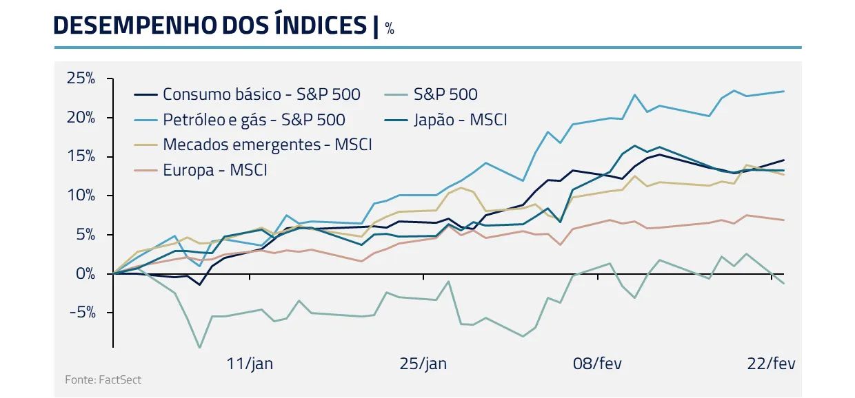 Parte dos investidores reagiu diversificando portfólios para setores e geografias menos expostos à I.A.. Mercados emergentes e segmentos fora das grandes plataformas americanas apresentaram performance superior no curto prazo.