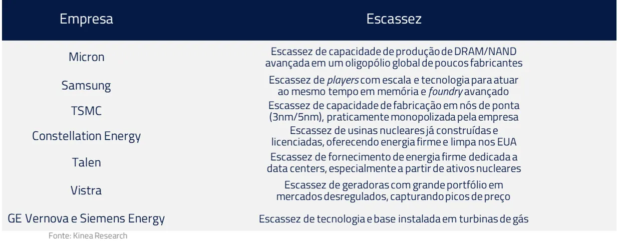 No ciclo atual de I.A., quem controla os insumos críticos controla a capacidade de gerar poder. GPUs de última geração, HBM escassa e semicaps que ampliam a fronteira de produção são os ativos estratégicos de um mundo onde os dragões digitais estão nascendo. Em um ambiente de disrupção acelerada, preferimos estar expostos a quem fornece o fogo, e não aos castelos que podem derreter.
