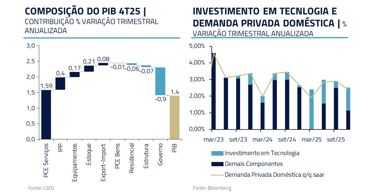 Apesar de uma desaceleração no PIB do 4º trimestre, em grande medida em função do shutdown do governo, o crescimento subjacente permanece saudável, sustentado por consumo de serviços e investimentos intensivos em I.A.. E, especialmente com os cortes do Fed do ano passado e a entrada dos rebates fiscais, a tendência é que a virada cíclica continue.