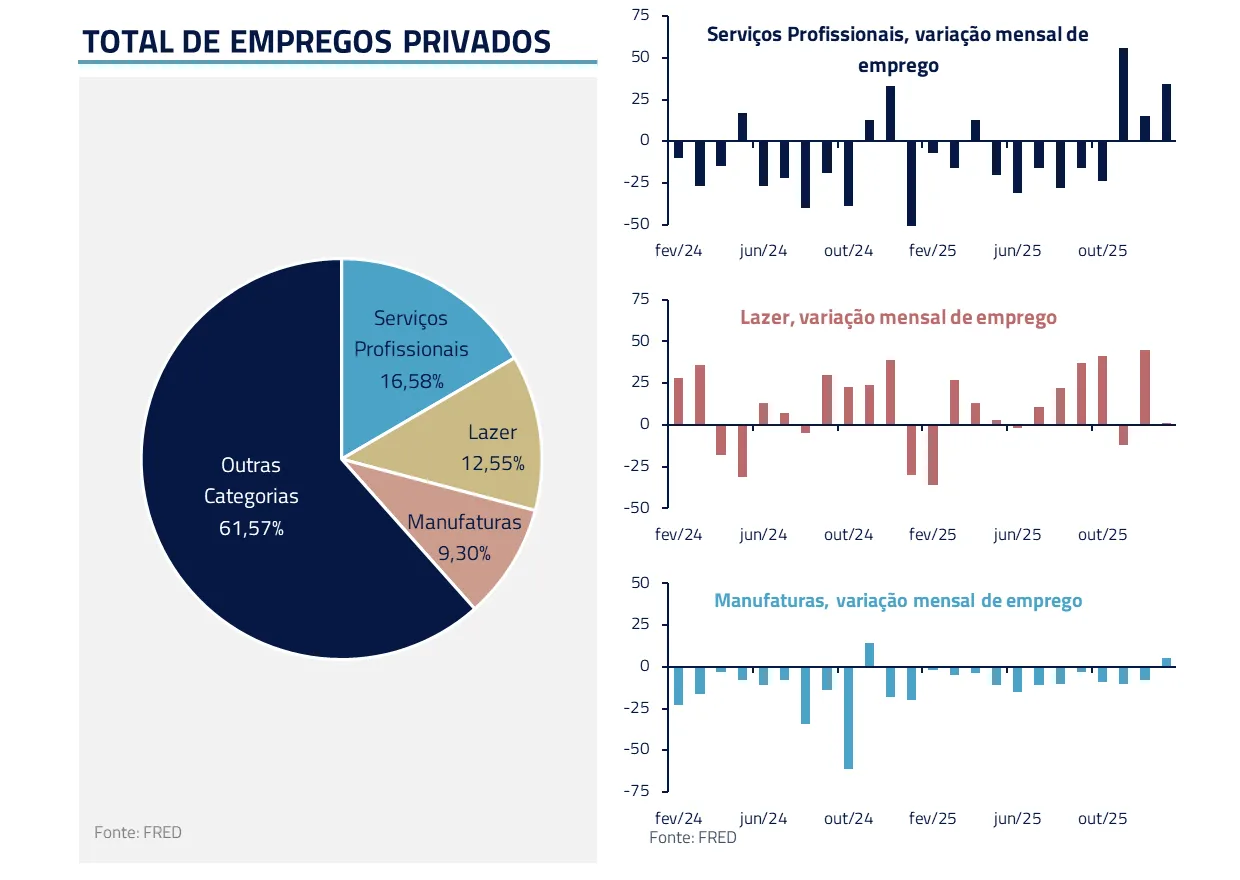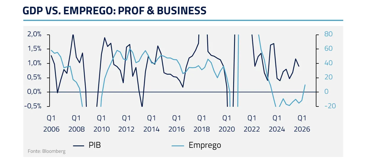Trata-se de um ciclo peculiar. Diferentemente de expansões baseadas apenas em consumo, este momento combina produtividade tecnológica com forte formação de capital. O dragão não apenas destrói castelos; ele também impulsiona crescimento. Alguns setores mostram claramente essa dicotomia, como serviços profissionais.