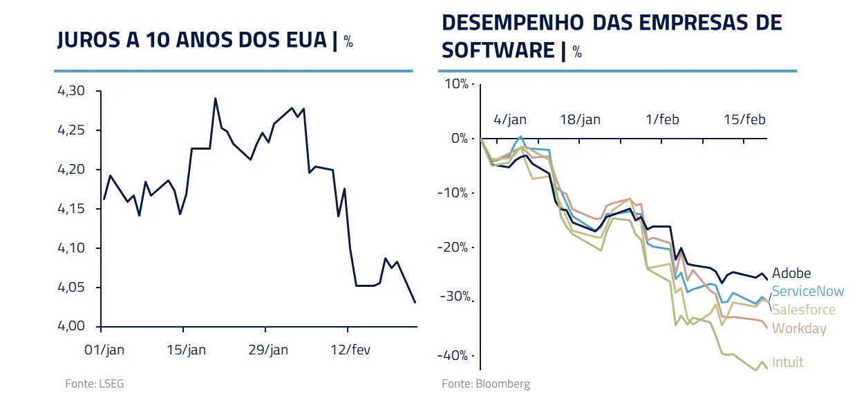 O mercado também parece começar a querer precificar um choque desinflacionário vindo da automação. As taxas longas dos Estados Unidos vêm fechando recentemente, refletindo a visão predominante de que a I.A. trará aumento do desemprego — especialmente no setor de serviços qualificados, gerando menor crescimento e menor pressão inflacionária estrutural.