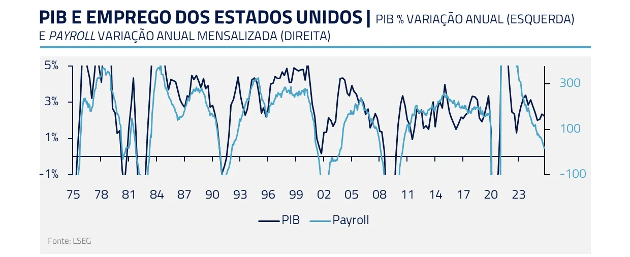 A questão mais relevante hoje é, portanto, qual o horizonte – e tamanho – desse potencial impacto versus sinais de inflexão cíclica que tendem a puxar o mercado de trabalho. O ponto de partida é um PIB que deve se sustentar em torno de 3% no 1º semestre e de 2% no 2º semestre. Historicamente, são números sugestivos de geração de emprego muito mais forte do que a atual.