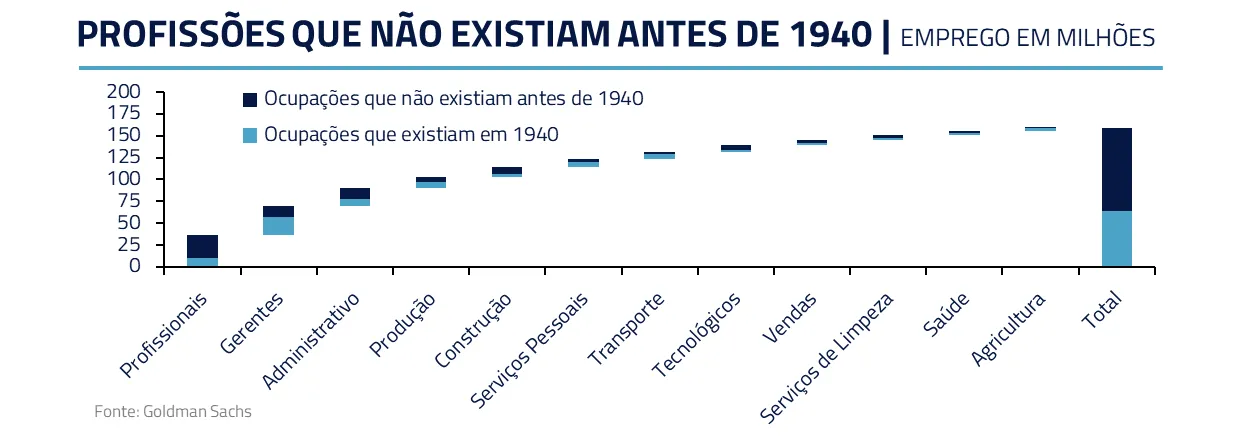 Outro fator comumente subestimado é que há ganhos de produtividade associados e novas funções que surgem em episódios de grandes rupturas tecnológicas. Se uma nova tecnologia amplia a produtividade e o PIB, a tendência é que mais renda vá buscar novas aplicações e demandas. Vale lembrar que boa parte das profissões existentes hoje não existiam há 80 anos.
