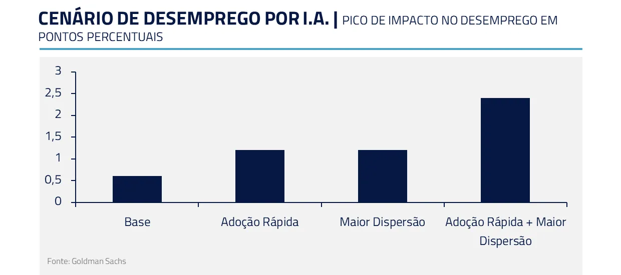 A médio prazo, a exposição de ocupações sensíveis a I.A. e a aceleração de adoção pelas empresas pode gerar um cenário mais disruptivo para o emprego. Mas, ainda assim, nos parece improvável um cenário de alta rápida e sustentada do desemprego.
