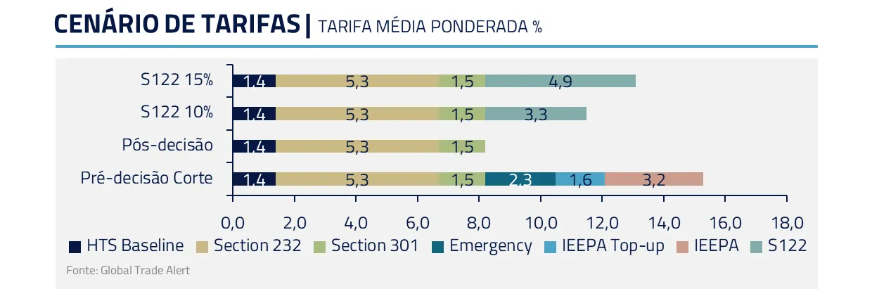 A aguardada decisão da Suprema Corte confirmou a limitação à autoridade presidencial para imposição de tarifas via emergência nacional (IEEPA). O governo Trump rapidamente implementou sua brecha constitucional de tarifar em 15% todos os países, com base na seção 122, além de ter aberto investigações em outras frentes.