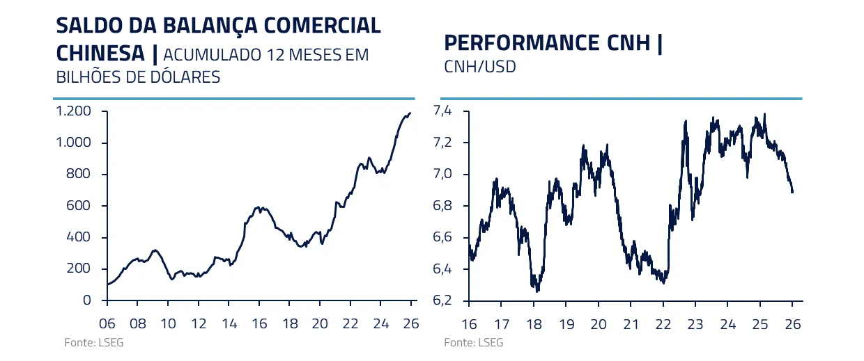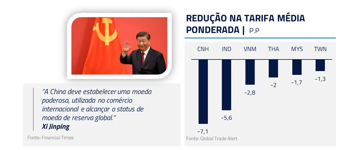 A China tem dado vários indícios de que gostaria de ampliar o uso global do yuan como moeda de reserva. A rigor, antes das novas investigações americanas, a derrubada do IEEPA deixa os asiáticos – em especial a China – em melhor posição relativa. E a viagem de Trump vem a calhar: reduz a probabilidade de novos fatores irritantes nas frentes comerciais, dando alívio de curto prazo para o comércio asiático.