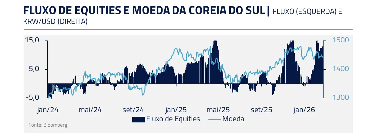 Os vetores domésticos também parecem apontar para virada: a Coreia do Sul concentra exportações de semicondutores e memória, esta última no centro da narrativa de escassez; e o governo passou a dificultar os incentivos para enviar capital ao exterior, reduzindo a atratividade fiscal desses fluxos para fora do país.