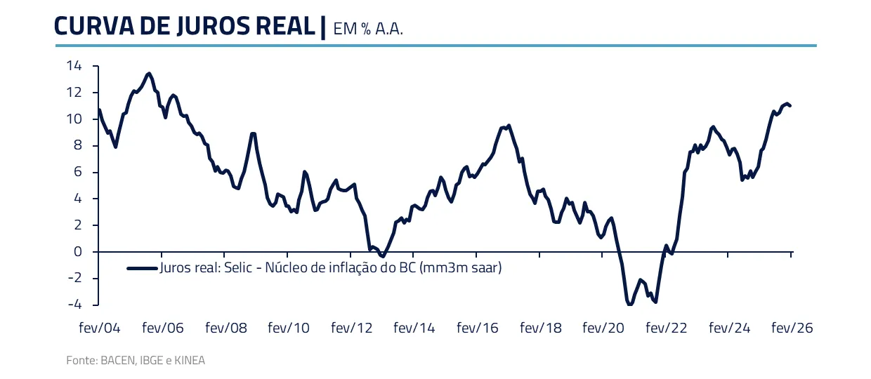 Vemos a taxa de juros em patamar bastante restritivo. Desde a última alta de Selic, o juro real subiu 120 pontos-base com a desinflação observada no período.