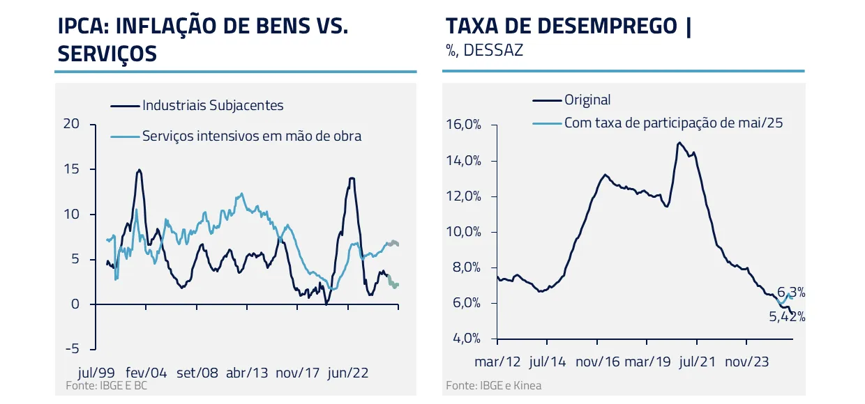 Para o horizonte do Fed, seguimos achando que há uma assimetria para baixo na taxa de desemprego. E, vale lembrar, a inflação de serviços continua resiliente excluindo a parte de aluguéis. Em contexto de escassez de mão de obra, setores cíclicos poderiam criar um risco de reaceleração, impedindo que o Fed entregue os cortes precificados para o 2º semestre e pressionando novamente a curva americana.