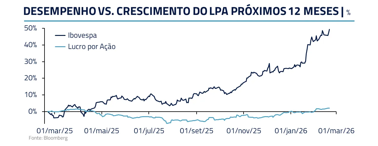 Em ações brasileiras, passamos a trabalhar vendidos em índices, entendendo que a elevação recente de preços não encontra respaldo proporcional na evolução dos lucros. Mantemos posições específicas em utilities, no programa habitacional e na Embraer, mas protegemos a carteira com posições táticas vendidas.
