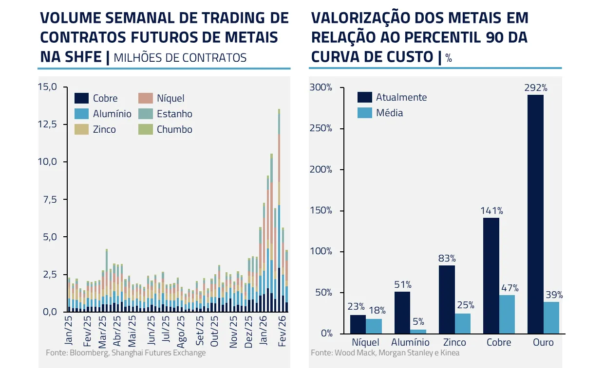 No segmento de metais, reduzimos exposição. Saímos de ouro e demais metais preciosos diante da intensificação de movimentos especulativos — especialmente na China — que, em nossa avaliação, distorceram os preços em relação aos fundamentos.