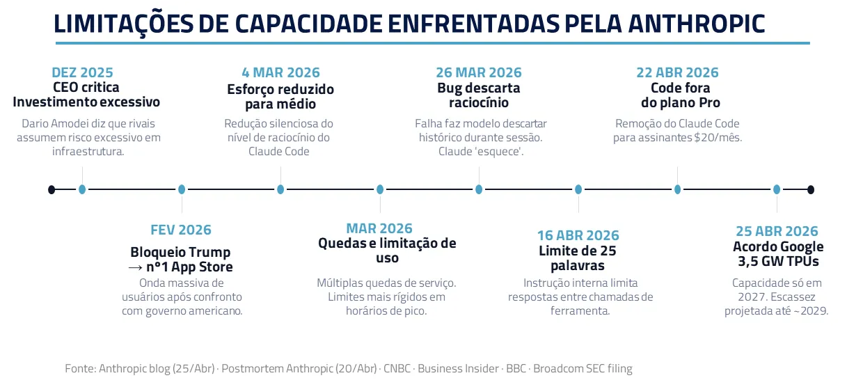 O episódio envolvendo a Anthropic foi emblemático. A companhia enfrentou limitações reais de capacidade após a alta de utilização de seus modelos, evidenciando que a restrição de oferta já afeta até os players mais avançados.