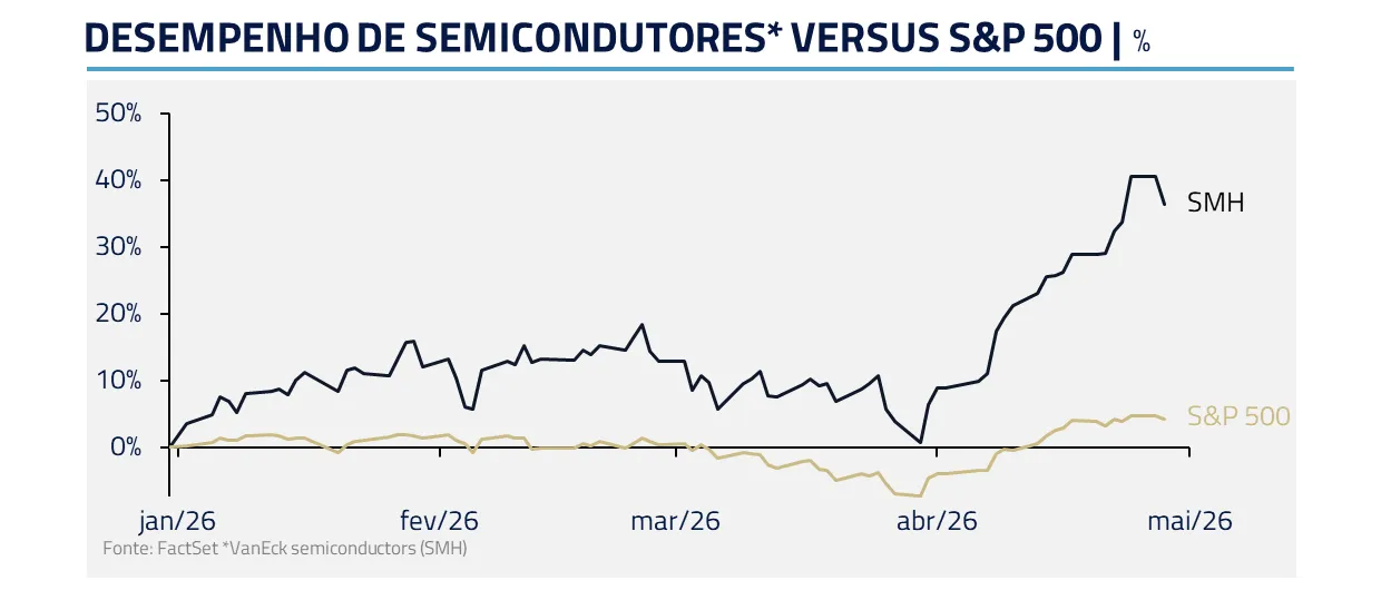 Esse episódio validou, em retrospecto, a estratégia agressiva da OpenAI de garantir capacidade cedo e em escala. Mais do que uma disputa entre modelos, o mercado voltou a enxergar a inteligência artificial como uma corrida por ativos físicos escassos: energia, data centers, semicondutores, memória e equipamentos. Não por acaso, esse aperto recolocou em evidência o chamado infra trade, evidenciado pelo forte desempenho de semicondutores no período.