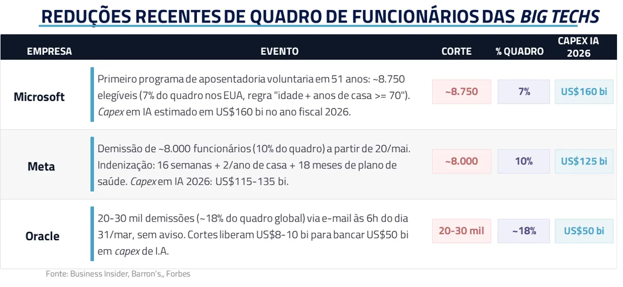 Ao mesmo tempo, a difusão da IA começa a produzir efeitos mais tangíveis no mercado de trabalho. Parte importante do setor de tecnologia tradicional vem cortando custos e redirecionando recursos para capex intensivo em IA, enquanto empresas nativas dessa nova onda seguem expandindo. O ponto central é que estamos vendo, cada vez mais claramente, uma substituição de gasto com pessoas por gasto com máquinas.