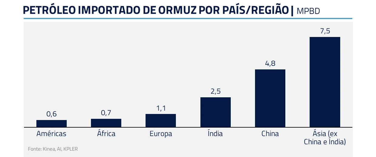 Quanto mais tempo persistirmos com um déficit próximo de 9 milhões de barris por dia, mais o choque deixa de ser apenas de preço e passa a ser de quantidade. Nesse cenário, a restrição começa a atingir diretamente a atividade, sobretudo na Ásia e na Europa, regiões mais dependentes de importações e mais expostas a essa rota. Estados Unidos e Brasil, por outro lado, tendem a mostrar resiliência relativa maior.