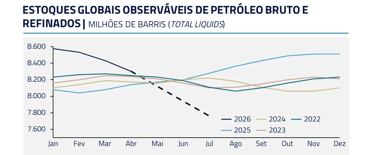 Sendo assim, os contratos mais curtos têm sido pressionados pela baixa disponibilidade do ativo físico, cujos estoques caminham rapidamente para os menores níveis da história recente. Esse cenário cria uma convexidade para a distribuição de preços: conforme o fechamento do estreito se estende, aumenta-se o risco de faltar petróleo e, consequentemente, o preço do ativo subir de forma não linear.