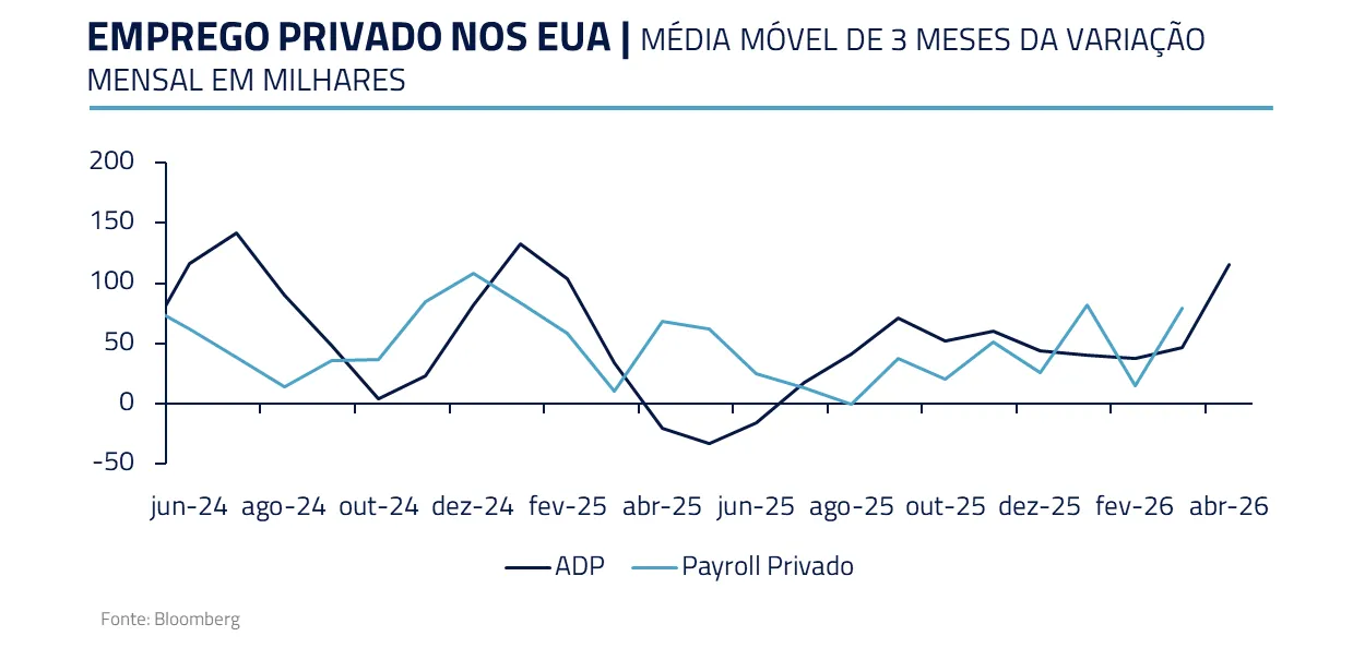 No mercado de trabalho, a volatilidade elevada dos dados mensais de emprego chama a atenção. Embora seja difícil confiar a valor de face, o conjunto das métricas mostra estabilização do mercado de trabalho, ainda que em níveis baixos.
