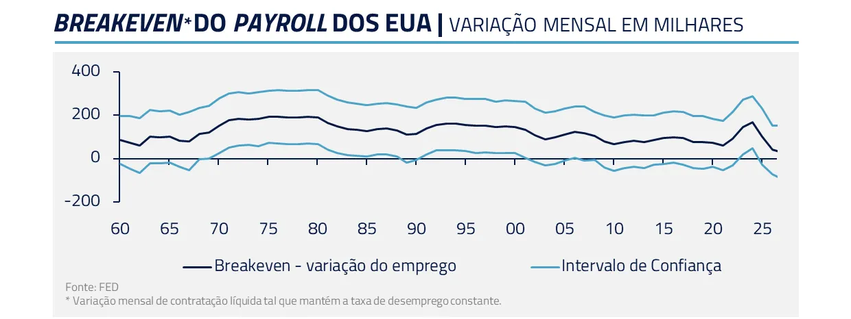 Apesar da estabilização incipiente, estudos do próprio Fed apontam para uma revisão do emprego de equilíbrio (breakeven) para baixo. Nesse sentido, cria-se uma curiosa assimetria onde o emprego pode crescer pouco e mesmo assim gerar queda no desemprego, dada a imigração muito fraca.
