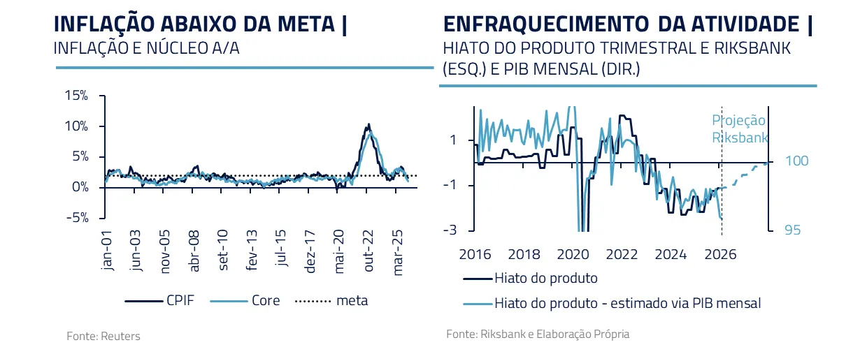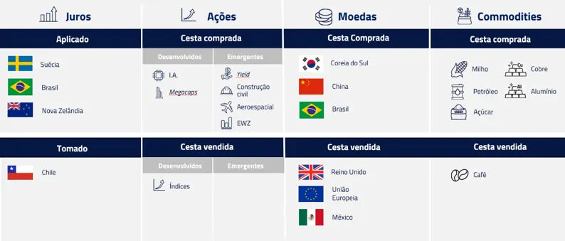 Fora dos EUA, conseguimos ver mais claramente oportunidades em juros. Seguimos vendo valor em posições aplicadas em economias como a Suécia, onde a inflação parte de nível muito abaixo da meta – com espaço para absorção do choque de energia. Além disso, a recuperação que se desenhava, partindo de uma economia ainda muito abaixo do seu potencial, já dá sinais de perda de tração.