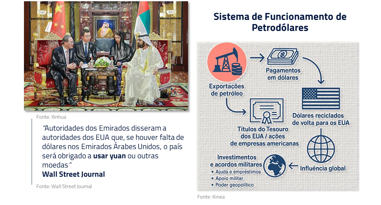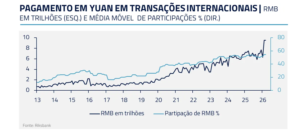 Em paralelo, permanecemos construtivos no yuan, em um contexto em que a arquitetura dos petrodólares passa a ser gradualmente questionada e a internacionalização da moeda chinesa ganha espaço.