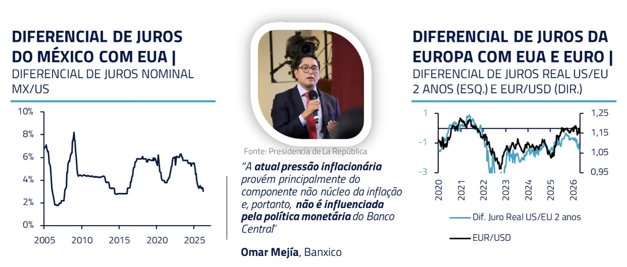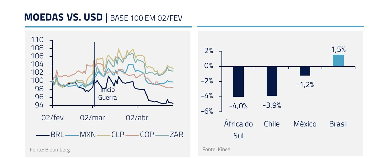 O principal risco para esse cenário é um agravamento dos conflitos no Oriente Médio. Caso as tensões se intensifiquem e o Brent supere USD 150 por barril, o ambiente de apetite a risco que tem sustentado a valorização do BRL dificilmente se manteria. Movimentos de aversão a risco tendem a penalizar de forma mais intensa moedas de high beta, categoria na qual o BRL se enquadra.
