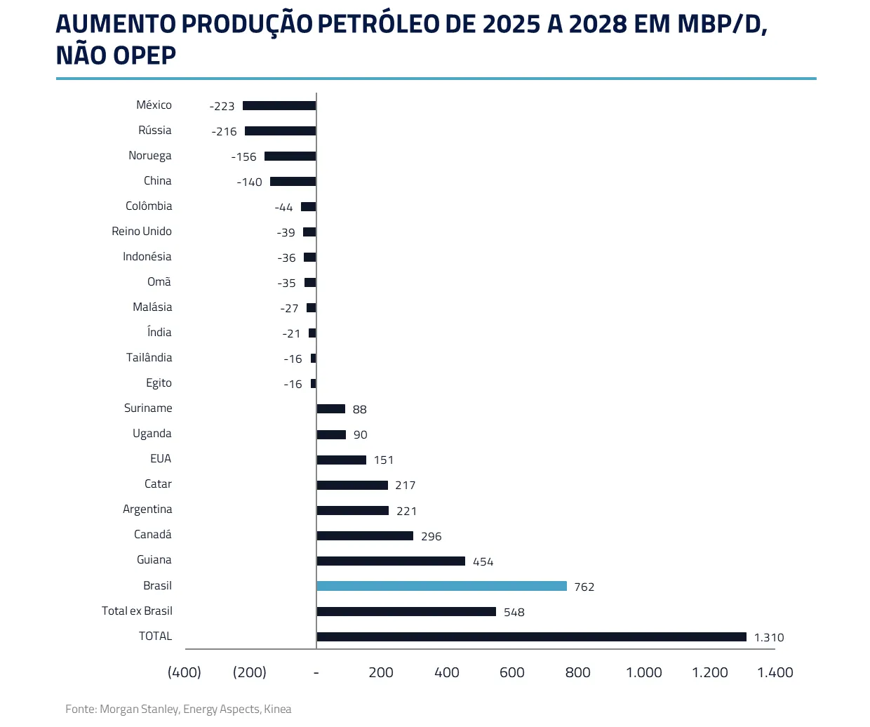 O Brasil se destaca também na perspectiva de aumento de produção de petróleo bruto. Até 2028, seremos a maior contribuição marginal de aumento de produção de petróleo fora da OPEP, com 762 mbp/d, quase 60% do aumento de produção de países não-OPEP.