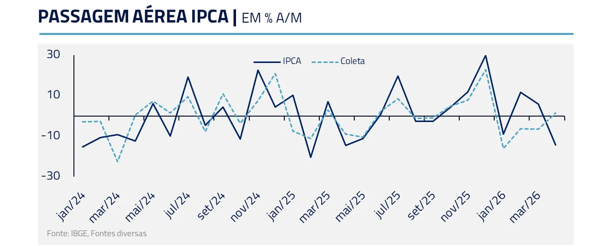 Boa parte da surpresa se concentrou em passagens aéreas, representando 40 bps dos 70 bps, sem relação com a Guerra. Vale lembrar que o IBGE coleta esses preços com dois meses de antecedência, ou seja, a leitura de março reflete preços capturados em janeiro. As coletas privadas, que historicamente têm boa correlação com o IPCA, descolaram nesse período, mas acreditamos que o movimento é pontual.